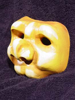 After my first two Alder wood masks had been carved I had two small block scraps to play with. Deciding I could only make half-masks from these blocks, I chose to make a couple of commedia styled Zanni masks. This first Zanni I didn’t have a clear idea what I wanted to carve so I just let the wood take me where it wanted. This chubby little pug face emerged and after sanding it I decided to paint it in golden ochre tones.