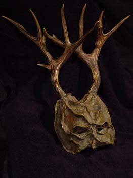 This mask is over 25 years old. I made it for a party based upon Falstaff’s mask in The Merry Wives of Windsor. The base is made of plaster bandage to fit my face. The real deer antlers were attached with more plaster bandages and the face was modeled with Cel-U-Clay. It was painted with a thick coating of acrylic paints. The weight of the antlers requires the wearer to keep the head erect.